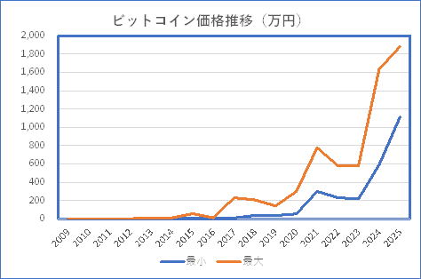 2024年ころから、米国などで大量の資金が投入され、1BTCは一時1800万円を越えました。 15年前に最初に値がついたときの1億倍です。