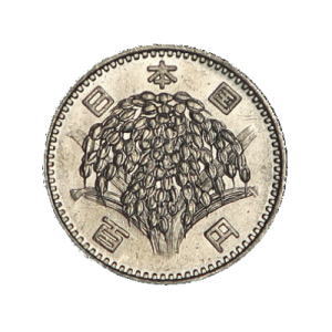 2年後に稲のデザインに変更され、その8年後の昭和42年に白銅貨になりました。 銀貨が発行されていたのは10年間でした。